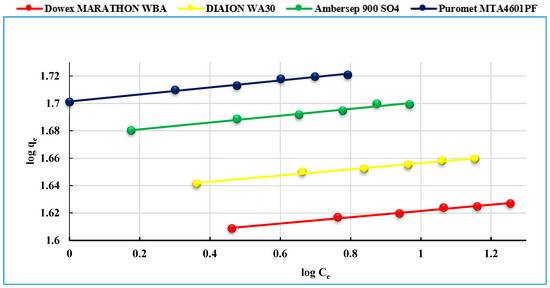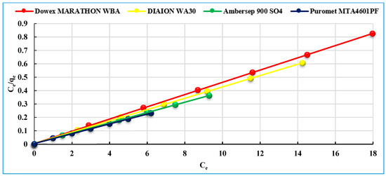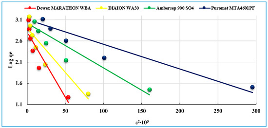 - From the Dubinin–Radushkevich isotherm, the values of the mean free energy of adsorption revealed that the sorption mechanism for Dowex Marathon WBA, Diaion WA30 and Ambersep 900 SO4 was predominantly, due to a physical nature (E < 8.0 KJ/mo1). However, the data obtained for free energy for Puromet MTA4601PF (E = 9.28 KJ/mo1) indicated that the sorption mechanism proceeded via chemisorption.