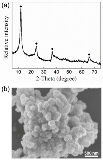 The XRD pattern (Figure 1a) of the synthetic sample shows that only birnessite phase is present. The four diffraction peaks at 2θ = 12.4°, 24.9°, 37°, and 65.5° confirm the formation of birnessite with hexagonal layer symmetry. The representative SEM image (Figure 1b) shows that the synthetic birnessite particles present platelet morphology with a diameter of ~300–400 nm and assemble to form flower-like aggregates. The BET specific surface area of the synthetic birnessite is 45.5 m2/g, which is consistent with the small thickness of birnessite platelets. These characteristics agree well with the previously reported properties of birnessite synthesized via reductive precipitation of KMnO4 by HCl [37].
