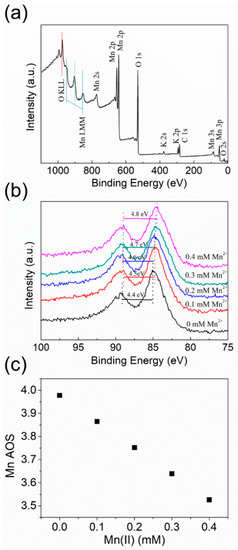 Although Mn AOS of birnessite has been extensively measured using redox titration or X-ray absorption near-edge spectroscopy (XANES) [40], XPS can provide information about AOS changes specifically on the surface or in the near-surface region of birnessite after reaction with aqueous Mn2+ at a lower concentration range. Figure 3a shows the survey scan of the as-synthesized birnessite. In addition to the strong signals of Mn and O, the weak signals of C and K can be assigned to very small amounts of surface contaminants, probably resulting from the exposure to ambient air and residual KMnO4. Compared to the intensities of Mn and O peaks, the signals of C and K are much weaker, so the interference of the surface contaminants on the Mn2+–birnessite interaction is negligible.