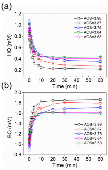 To explore the quantitative correlation between AOS values and oxidation rates of organic compounds by birnessite, we conducted the oxidation experiments of 1.82 mM HQ with 1.86 mM birnessite with different AOS values at pH 5.5. Figure 4 shows that, in all experiments, the HQ concentration exponentially decreased over time, whereas the corresponding BQ concentration rapidly increased as a function of time. After about 20 h, the concentration of both HQ and BQ reached a plateau. Moreover, the spontaneous formation of BQ was observed along with the rapid decrease in HQ. The nearly synchronous changes in the concentrations of HQ and BQ with time indicate that HQ adsorption on birnessite surface could not significantly contribute to the removal of HQ by birnessite under the conditions of this study. Moreover, the negligible sorption of HQ to birnessite and the rapid redox reaction between them make HQ an appropriate thermodynamic and kinetic chemical reactivity probes (CRPs) for birnessite with different AOS values [44].