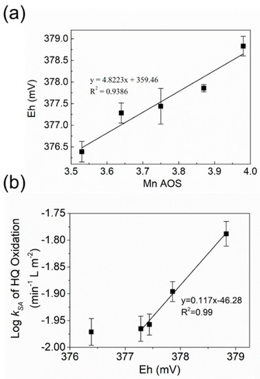 In order to quantify the correlation between AOS values and redox potentials of birnessite, the oxidation experiments of 2.73 mM HQ by 1.86 mM birnessite with different AOS values were conducted at pH 5.5. As shown in Figure S2, the extent of HQ oxidation highly depends on Mn AOS of birnessite at the same initial HQ concentration and birnessite loading. At pH 5.5, as the Mn AOS of birnessite decreased from 3.98 to 3.53, the concentration of HQ at equilibrium increased from 1.25 ± 0.01 to 1.39 ± 0.03 mM, but that of BQ decreased from 1.88 ± 0.01 to 1.73 ± 0.00 (Figure S2). A similar trend was observed at pH 4.5 and 6.5 (Figure S2). Moreover, with the increase in pH from 4.5 to 6.5, the extents of HQ oxidation and BQ production decreased significantly. The black color of particle suspension at equilibrium suggests that birnessite was not completely reduced by HQ at equilibrium, and thus the oxidation potential (Eh) of birnessite can be estimated from the concentrations of HQ and BQ at equilibrium, according to the method described in Section 2.3. As shown in Figure 5a and Figure S3, the calculated Eh of birnessite is linearly proportional to its Mn AOS at pH 4.5–6.5. Moreover, the Eh value of birnessite at pH 5.5 determined from the thermodynamic data of HQ oxidation in this study was 376–379 mV, which falls into the Eh range of birnessite previously reported [45]. For birnessite with a fixed AOS value, the observed Eh value obviously increased with the decrease in pH, suggesting an increasing oxidative reactivity of birnessite under acidic conditions. This pH dependence has been widely observed in oxidation of nearly all model compounds by manganese oxides, which can be attributed to the promoted sorption and electron injection of organic molecule to the birnessite surface [46,47].