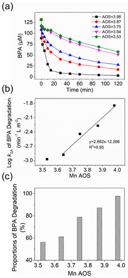 One promising application of birnessite is to remove organic contaminants in natural environments [8]. Understanding how the Mn2+–birnessite interactions affect the oxidative reactivity of birnessite for contaminant degradation is critical to predict the long-term efficiency of birnessite for contaminants. Here, BPA was selected as a model contaminant to investigate the relationship between Mn AOS of birnessite and its capability in BPA attenuation. Figure 6a shows the kinetic profiles of BPA degradation (the initial BPA concentration = 131.4 μM) by 2.80 mM birnessite with different AOS values at pH 5.5. In all experiments, the BPA concentration rapidly decreased at the initial stage, and then the removal rate gradually decreased with time. A good linear correlation between the logarithm of the surface area-normalized pseudo-first-order initial rate constants (log kSA) of BPA oxidation and birnessite AOS was observed (Figure 6b). As AOS decreased from 3.98 to 3.53, the corresponding log kSA decreased from −1.845 to −2.973 min−1 L m−2.