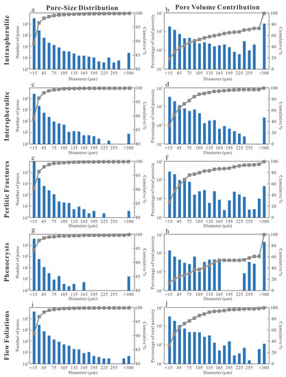 Clustered spherulites (Figure 7g,h) exhibit similar pore-size distribution and pore-volume contribution patterns with those of the groundmass. Both the pore number and volume are dominated by small pores.
