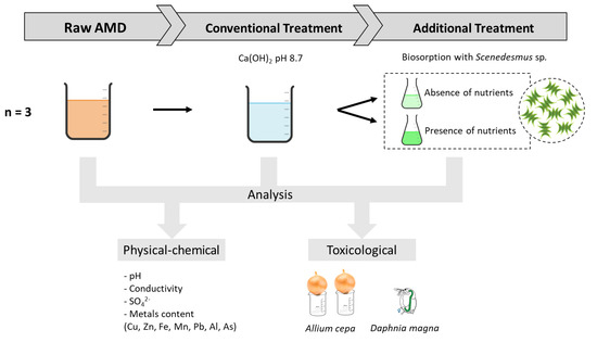 The conventional treatment of AMD was conducted based on the treatment carried out by Brazilian mining companies. First, the pH was raised to 8.7 by adding the alkaline reagent (calcium hydroxide—Ca(OH)2) under stirring and monitoring the pH with a pH meter, followed by precipitation of the metals as hydroxides. The supernatant was filtered and then separated for the additional treatment with algae.