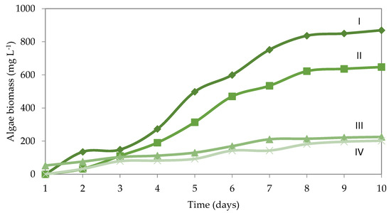 The conventional treatment was satisfactory considering the pH correction, 60% reduction in the sulfate content, and almost total removal of Fe, Al and Zn. However, for Mn and As, the treatment efficiency was not sufficient to achieve the limits stablished by the legislation. Thereafter, additional treatment with algae was investigated for polishing and removing the remaining metals. The AMD after conventional treatment was submitted to contact with Scenedesmus sp. and their growth was monitored over 10 days for each scenario in terms of biomass (Figure 2).
