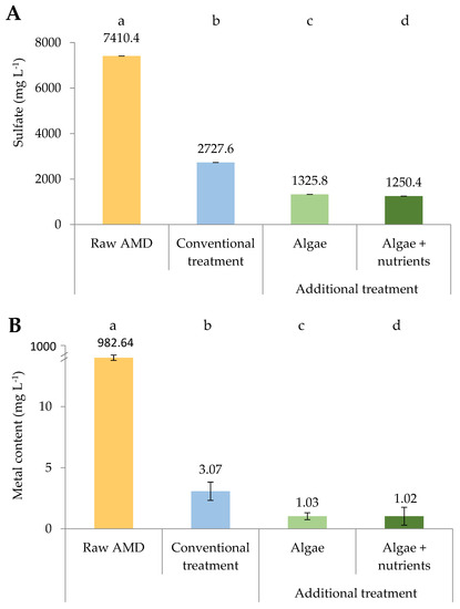 Comparison between raw AMD, conventional and additional treatments in terms of sulfate (A) and metal content (B). Means that differ significantly (Tukey’s test, p < 0.05) are indicated by different lowercase letters.
