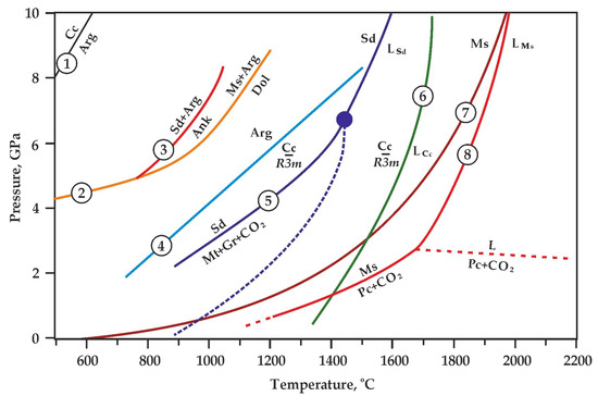 - Shatskiy, A.F.; Litasov, K.D.; Palyanov, Y.N. Phase relations in carbonate systems at pressures and temperatures of lithospheric mantle: Review of experimental data. Russ. Geol. Geophys. 2015, 56, 113–142. [Google Scholar] [CrossRef]