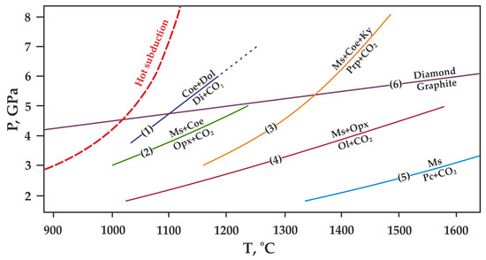 P,T diagram with previously constrained decarbonation curves, resulting in the formation of CO2 fluid and (1) diopside [17], (2) orthopyroxene [15,19], (3) pyrope [20], (4) olivine [13,14], (5) periclase [6]. The graphite-diamond direct transition line (6) is given according to [48]. Ms—magnesite, Dol—dolomite, Di—diopside, Pc—periclase, Opx—orthopyroxene (enstatite), Ol—olivine (forsterite), Coe—coesite, Ky—kyanite, Prp—pyrope.