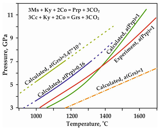 P,T diagram with previously experimentally constrained and calculated decarbonation curves, resulting in the formation of CO2 fluid and garnet solid solutions [20]; a—activity of component, Ms—magnesite, Ky—kyanite, Co—coesite, Prp—pyrope, Grs—grossular.