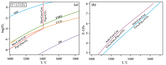 T-ƒO2 diagram (a) with lines of buffer equilibria (according to [60,61,62]), as well as the decarbonation reaction [53] and P,T diagram (b) with the theoretical positions of decarbonation reactions involving ankerite and dolomite, as calculated in this paper [58,59]. MH (magnetite-hematite), FMQ (fayalite-magnetite-quartz), IW (iron-wüstite), CCO—buffer equilibria; Ms—magnesite, Coe—coesite, Crn—corundum, Prp—pyrope, Mgt—magnetite, Ru—rutile, Ilm—ilmenite, Dm—diamond.