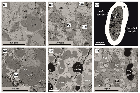 In a dolomite-bearing system (CaMg(CO3)2-SiO2-Al2O3), experiments were carried out in the temperature ranges of 1050–1150 °C (3.0 GPa), 1150–1450 °C (6.3 GPa), and 1450–1550 °C (7.5 GPa). Recrystallization of the initial dolomite and oxides, as well as a small amount of newly formed kyanite at the contacts of corundum and coesite (Figure 10a), was established in samples obtained at temperatures below the decarbonation reactions. At higher temperatures, after the onset of the decarbonation reaction (Figure 10b–f), grossular–pyrope garnet and CO2 fluid, kyanite, and recrystallized carbonates and oxides are formed. During the experiments, the resulting fluid segregated and formed cavities in the samples (from 50 to 100 μm) (Figure 10c,f). The compositions of the obtained mineral phases are shown in Table 5. The composition of synthesized garnet in all experiments corresponded to Ca0.5–0.8Mg2.23–2.57Al1.92–1.98Si3O12.