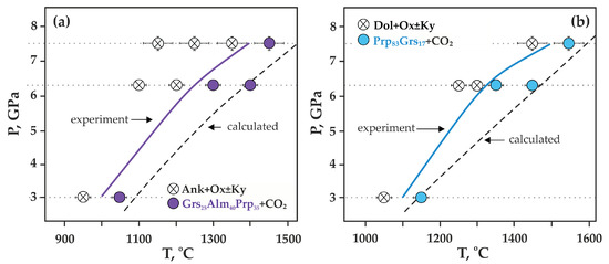 P,T diagrams with experimental parameters and results (this study): (a) Ca(Mg,Fe)(CO3)2-SiO2-Al2O3 system, (b) CaMg(CO3) 2-SiO2-Al2O3 system; dashed lines—calculated position of the reactions of complete decarbonation—Grs50Prp25Alm40 (a) and Grs50Prp50 (b).