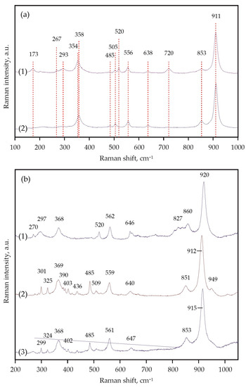 Representative Raman spectra of the obtained garnets: (a) (1)—run N 2145-A, 7.5 GPa, 1450 °C, (2)—run N 2115-A, 6.3 GPa, 1300 °C; (b) (1)—run N 2157-D, 7.5 GPa, 1550 °C, (2)—run N 2155-D, 6.3 GPa, 1250 °C, (3)—run N 2122-D, 3.0 GPa, 1150 °C.