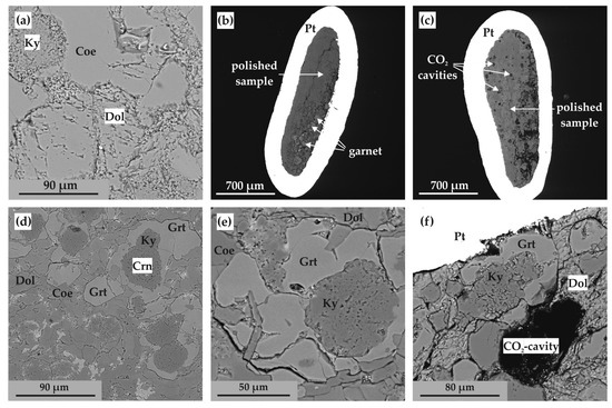 SEM micrographs (backscattered electrons (BSE) regime) of polished sample fragments (CaMg(CO3)2-SiO2-Al2O3 system): (a) polycrystalline aggregate of dolomite, coesite and kyanite (N 1743-D); (b,c) sections of Pt-capsules with samples (N 2155-D and 2157-D); (d,e) zoned aggregates of corundum, kyanite, and garnet in dolomite–coesite polycrystalline matrix (N 2122-D and 2112-D); (f) zoned aggregates of kyanite and garnet and CO2 fluid cavities in dolomite–coesite polycrystalline matrix (N 2120-D); Dol—dolomite, Coe—coesite, Ky—kyanite, Crn—corundum, Grt—garnet.