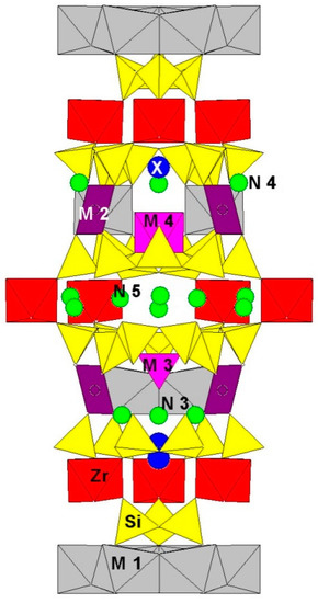 Blocky isomorphism is defined as the ability of groups of atoms or ions having different configurations to replace each other in crystal structures [14]. Such substitutions are known for a large number of alkaline zircono- and titanosilicates [9]. In EGMs this kind of isomorphism is realized at the key sites M2, M3, and M4, as well as at the N and X sites. The eudialyte group is the only group of minerals in which blocky isomorphism is realized at several sites containing high-force-strength cations. Below we will use the symbols N1–N5, M2, M3, M4, and X to denote corresponding cavities (i.e., micro-regions which can contain several closely spaced sites).
