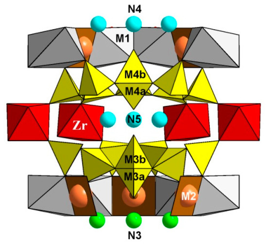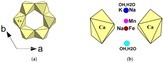 An example of EGM with an unusually high Ca content is feklichevite, Na11Ca9Fe2Zr3NbSi25O73(OH,H2O,O,Cl)5 [37]. In this mineral, Ca completely occupies the M1 site in the ring of octahedra and dominates at the neighboring N3 site. A cluster formed by three Ca-centered polyhedra sharing common vertices occurs at the threefold axis completed by six M1 octahedra (Figure 12b).