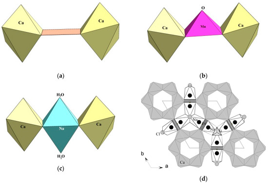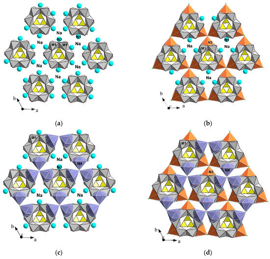 Golyshevite and mogovidite are the most Ca-rich EGMs (Table 3). In these minerals, Ca occupies the M1 site in the ring of octahedra and dominates over Na at N(4) (in golyshevite [39], Figure 12c) or at both N(3) and N(4) (in mogovidite [38]). In the latter case, a double layer of Ca-centered polyhedra is formed (Figure 12d).