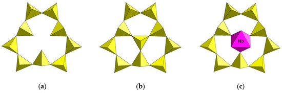 The micro-regions M3 and M4 at the centers of two nonequivalent Si9O27 rings can be vacant, but usually they contain tetrahedra (SiO4, rarely AlO4) or octahedra (typically, NbO6; rarely, TiO6, WO6, MnO6, and NaO6) [1] (Figure 5). The positions of M3 and M4 cations are located on the threefold axis, and their charge can vary from +1 (Na) to +6 (W). When SiO4 tetrahedron occurs in the M3 or M4 micro-region, corresponding Si9O27 ring transforms into a 10-membered disc consisting of three 5-membered rings (Figure 5b).