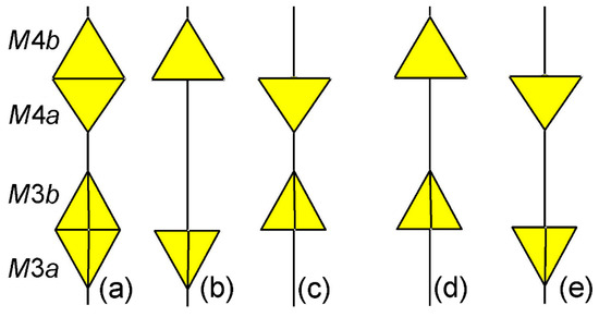 (a–e) A scheme showing different options of mutual orientation of the M3 and M4 tetrahedra.
