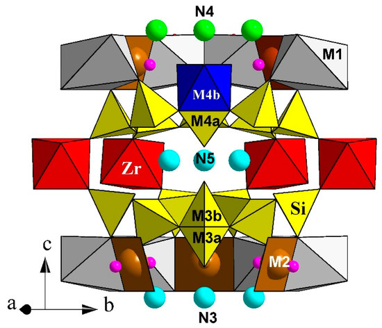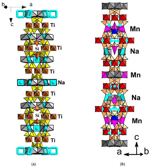 In the structure of dualite (Sample 3 in Table 4; see Figure 14a) [43], alternation of Zr and Ti in the modules I and II takes place. The M3 + M4 and M3* + M4* micro-regions of dualite are dominated by IVMn and Si, respectively. There are also significant differences in the populations of the VNa-dominant M2 and M2* sites of dualite.