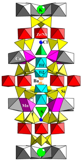 - Rastsvetaeva, R.K.; Aksenov, S.M.; Chukanov, N.V. Crystal structure of zircono-niobosilicate with Ti-centered Si9O27 rings as a new member of the eudialyte group. Doklady Phys. Chem. 2010, 432, 106–110. [Google Scholar] [CrossRef]