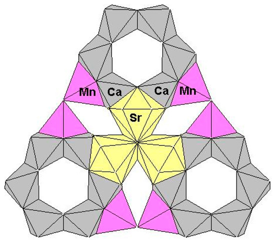 The layer formed by the M1Ca6, N4Sr10, and N3Mn2+5 polyhedra in “eucolite” (Sr- and Mn-rich EGM viewed along (001) [27,34]).