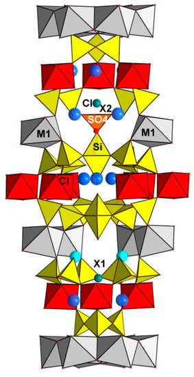 In most S-bearing EGMs, sulfur occurs in the sulfate form. In these minerals, isolated SO4 tetrahedra occur at the sites located on the threefold axis (see Figure 10 and Figure 13). A potentially new EGM containing sulfur in the sulfide form has been discovered recently in the Lovozero alkaline massif, Kola Peninsula [72]. Hypothetically, this mineral crystallized at a low activity of oxygen. Its end-member formula is (Na14Sr)Ca6(Mn2Na)Zr3[Si26O72](OH)3S2−·2H2O. In the sulfide EGM, the X1 and X2 sites are split into pairs of closely spaced sub-sites with the following occupancies: X1a = 0.41(S2− + Cl), X1b = 0.39H2O, X2a = 0.33(S2− + Cl), X2b = 0.30H2O. The S2− anions belonging to the X1 and X2 micro-regions coordinate triads of Sr2+ and Na+ cations with the Sr–S and Na–S distances of 2.322 and 2.541 Å, respectively.