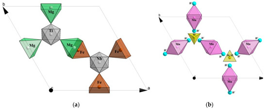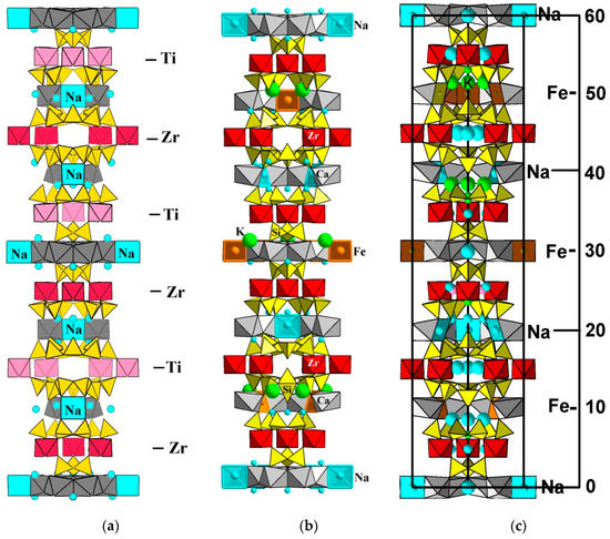 Ordered isomorphism at the Z site in dualite [73] (a), at the M2 and N3 sites in rastsvetaevite holotype [23,74] (b), and at the M2 and N4 sites in hydrated rastsvetaevite [8,75] (c), viewed along (210).