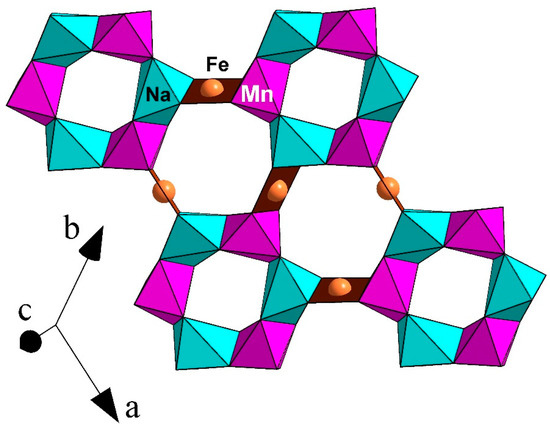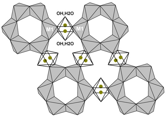 The most complex blocky isomorphism is realized in the M2 micro-region situated between rings of octahedra, M16O24 [15]. This micro-region can be populated by cations having different radii, charges, and coordination (from flat square formed by edges of octahedra belonging to two neighboring M16O24 rings to a 7- or 8-fold polyhedron): IVFe2+, VFe2+, VFe3+, VIFe3+, VMn2+, VIMn2+, IVZr, IVTa, IVNa, VNa, VINa, VIINa, VIK, VIIK, and VIIIK. The M2-cations occur in the plane of the six-membered rings which is perpendicular to the threefold axis (Figure 2). The coordination polyhedra M2O5 and M2O7 can have different orientations with respect to the plane of the square. Some examples of M2-centered polyhedra are shown in Figure 3.