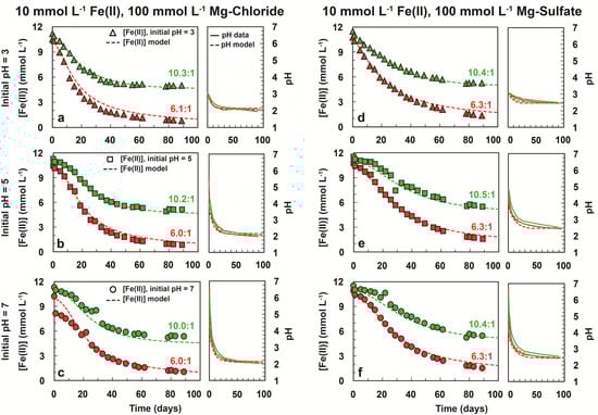 The dissolved Fe(II) concentration and pH versus time in systems containing approximately 10 mmol L−1 Fe(II) with 1.67 ([Fe(II)]/[ClO3−] ≈ 6) mmol L−1 and 1 mmol L−1 (≈10) ClO3− in 10−1 mol L−1 MgCl2 at initial (a) pH 3, (b) pH 5, and (c) pH 7, and in 10−1 mol L−1 MgSO4 fluids at initial (d) pH 3, (e) pH 5, and (f) pH 7 at 24 °C. The ratios written alongside the curves represent the initial molar ratio between [Fe(II)] and [ClO3−].