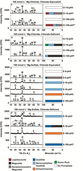 XRD patterns of the mineral products (left) and phase proportions generated using Rietveld refinement (right) for the corresponding XRD scans (Figures S3–S6) of the precipitates formed by the oxidation of dissolved Fe(II) by chlorate (ClO3−). Chloride-rich fluids using (a) [Fe(II)]/[ClO3−] ≈ 6 and (b) [Fe(II)]/[ClO3−] ≈ 10 and sulfate-rich fluids using (c) [Fe(II)]/[ClO3−] ≈ 6 and (d) [Fe(II)]/[ClO3−] ≈ 10 were investigated. The sample labels depict fluid type, initial Fe(II) concentration (mmol L−1), MgCl2 concentration (mmol L−1), and initial pH (sample label details in Table 2, except segregated by initial Fe(II) to chlorate ratio). The abbreviated names of each experiment represent the fluid composition (either Cl = chloride, or S = sulfate), concentration of Fe(II) in mmol L−1, and the initial pH. Diagnostic peaks are as follows: G = Goethite, L = Lepidocrocite, M = Magnetite, GR = Green Rust, S = Schwertmannite, and Sa = Salt (bischofite [MgCl2·6H2O], halite [NaCl], or hexahydrite [MgSO4·6H2O]). The scans are offset from each other and scaled for better visualization; CPS = counts per second.