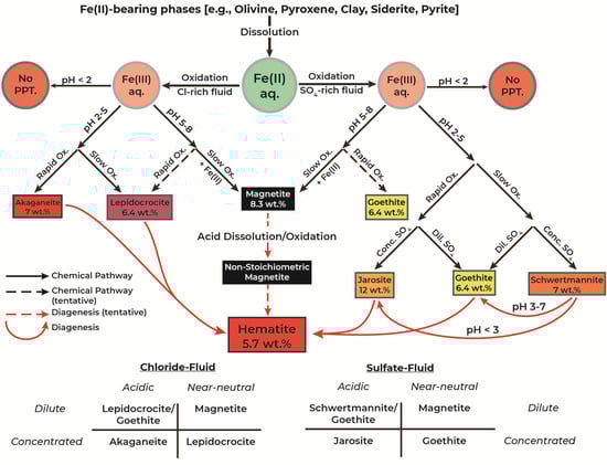 Slower rates of oxidation in chloride-rich, chlorate-deficient systems induced magnetite formation over lepidocrocite for initially circumneutral pH conditions. On the contrary, during faster Fe(II) oxidation, lepidocrocite formation is preferred over magnetite (Figure S7). The figure demonstrates how the mineral type is a strong function of the oxidation rate. A mixture of lepidocrocite and goethite is formed in near-neutral solutions if the rate of formation is slightly slower []. In chloride-rich fluids, systems favoring faster iron oxidation form akaganeite [], while those yielding slower oxidation rates form lepidocrocite and magnetite.