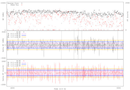 Since the information is collected every 30 min, the upcoming energy consumption EC and feed tonnage FT at 0.5 h support are denoted simply as EC and FT in reference to EC and FT, respectively. An upcoming EC and FT at 1 h support, EC and FT, are computed by averaging the next two energy consumption, EC and EC, and the two feed tonnage, FT and FT. Similarly, by averaging the upcoming ECs and FTs, different supports can be computed. Let be the time support in hours, which represents the average over a temporal interval of a given duration, then EC and FT are calculated as: