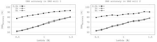 Accuracy of operational relative-hardness prediction at different time support as function of lambda () on both SAG mills.