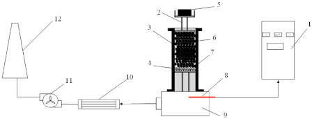 Schematic diagram of the pressurized densification sintering process of limonitic nickel laterite in sinter pot tests (1—control cabinet, 2—pressure device, 3—sinter pot, 4—hearth layer, 5—pressurized weight, 6—sinter bed, 7—bar grate, 8—thermocouple, 9—vacuum chamber, 10—condenser tube, 11—air blower, 12—chimney).