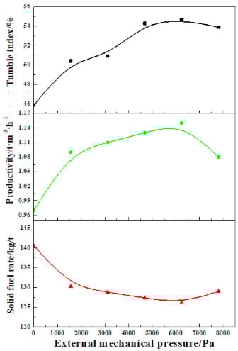 On the other hand, it is found that the maximum exhaust-gas temperature is proliferated dramatically with external mechanical pressure increased from 0 Pa to 6242 Pa, while that rises slightly as the external mechanical pressure continues to reach 7803 Pa. Furthermore, the sintering time is prolonged constantly with external mechanical pressure and the relevant vertical sintering speed is continuously lowered, as shown in Figure 5b due to the densification of the loose sinter from the surface to the central layer under external mechanical pressure [41]. This is harmful to the productivity of the product sinter to some extent. Therefore, considering the yield and the quality of the product sinter simultaneously, the suitable external mechanical pressure is supposed to be recommended at 6242 Pa, which is consistent with the results of Figure 3.