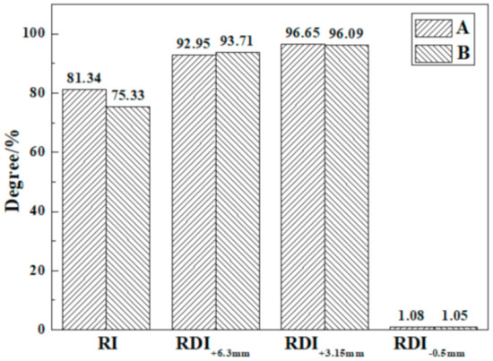 Figure 4 compares the metallurgical performance of the product sinter of the traditional and pressurized densification sintering processes. RI of product sinter is reduced slightly from 81.34% to 75.33% via pressurized densification sintering due to the densification of the product sinter unfavorable for reducing gas diffusing into the sinter [42], but it still perfectly satisfies the requirement of blast furnace production. Moreover, the RDI of the two sintering processes was close to the RDI+6.3mm and RDI+3.15mm of both over 90.00% and RDI−0.5mm of about 1.00%, owing to the high FeO content [43]. Thus, the product sinter of the pressurized densification sintering process also possesses adequate hot sinter strength in the blast furnace. Overall, the excellent metallurgical performance of the product sinter of the pressurized densification sintering process could be achieved.