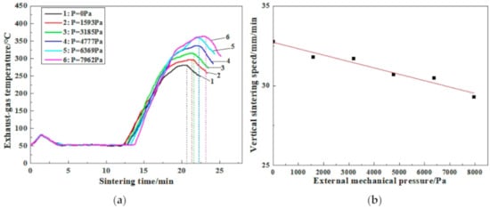 Variations of exhaust-gas temperature (a) and vertical sintering speed (b) with external mechanical pressure.