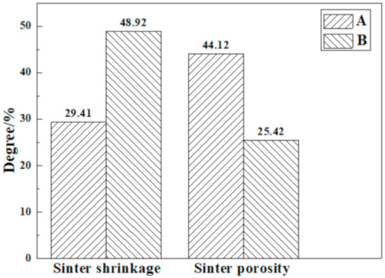 Porosity and shrinkage of the product sinter of different sintering processes (A) Traditional sintering process, (B) Pressurized densification sintering process.