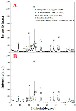 Figure 8 demonstrates the occurrence of the main minerals of the product sinter of the two sintering processes. Hercynite ((Fe, Mg)·(Fe, Al)2O4) acts as the major solid phase formed by Mg2+ and Al3+ ions substituting for Fe2+ and Fe3+ ions, respectively [40]. Liquid bonding phases mainly include kirschsteinite (CaO·FeO·SiO2), monticellite (CaO·MgO·SiO2), fayalite (2FeO·SiO2) and silico-ferrite of calcium and alumina (SFCA). The former two minerals are identified as eutectic olivine phases generated by the eutectic reaction of fayalite (2FeO·SiO2) with gangue minerals or excessive lime (CaO) [50]. SFCA is considered as the most desirable liquid bonding phase in iron ore sinter due to its excellent reducibility, high mechanical strength, and low reduction degradation [42]. It is found that the intensity and quantity of diffraction peaks of SFCA and fayalite (2FeO·SiO2) in product sinter of pressurized densification sintering process are much higher than that of traditional sintering process while kirschsteinite (CaO·FeO·SiO2), monticellite (CaO·MgO·SiO2) and hercynite ((Fe, Mg)·(Fe, Al)2O4) present the opposite rule. This indicates that pressurized densification sintering is in favor of the formation of more high-quality liquid bonding phases, especially for SFCA, through promoting particles diffusion in solid-phase and liquid-phase reactions. Hence, sintering performance of limonitic laterite could be obviously improved via pressurized densification sintering.