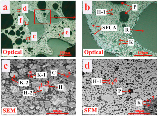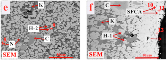 Microstructure of the product sinter (B) of the pressurized densification sintering process (H—(Fe, Mg)(Fe, Al)2O4, H-1—Fe(Fe, Al)2O4, H-2—(Fe, Mg)Fe2O4, K—CaO·(Fe, Mg)Al2O4·SiO2, SFCA—silico-ferrite of calcium and alumina, N—NiFe2O4, C—(Fe, Mg)(Cr, Fe, Al)2O4, P—Pore). (b–f) are the selected areas in (a).