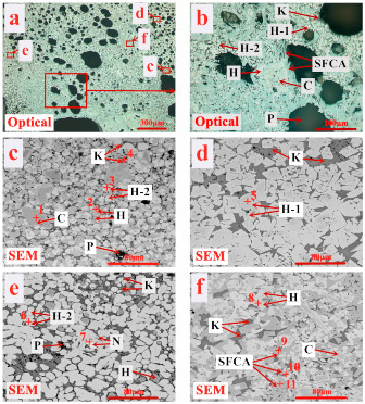 Microstructure of product sinter (A) of traditional sintering process (H—(Fe, Mg)·(Fe, Al)2O4, H-1—Fe(Fe, Al)2O4, H-2—(Fe, Mg)Fe2O4, K—CaO·(Fe, Mg) Al2O4·SiO2, K-1—CaO·FeAl2O4·SiO2, K-2—CaO·(Fe, Mg)Fe2O4·SiO2, SFCA—silico-ferrite of calcium and alumina, N—NiFe2O4, C—(Fe, Mg)·(Cr, Fe, Al)2O4, P—Pore, R—Resin). (b–f) are the selected areas in (a).