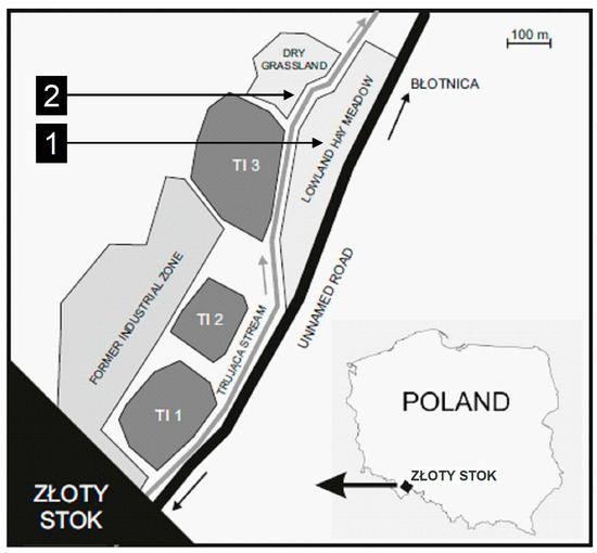 Location of the sites 1 and 2 under study. 1—Lowland hay meadow flooded by tailings. 2—Dry grassland on the plateau built of tailings. TI 1, TI 2, TI 3—tailings impoundments No 1, 2, 3, respectively. Błotnica—the name of a nearby village.