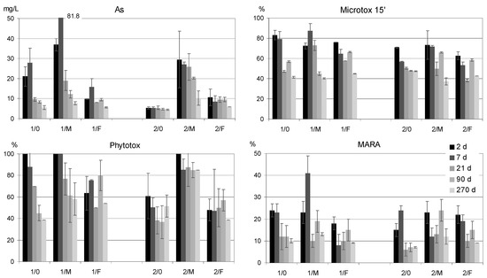 The material was crushed and sieved to <5 mm on site, and then transported to the laboratory, air-dried, and homogenized. A 270-day incubation experiment was carried out in 1 kg pots filled with untreated soils (0) or soils fertilized with inorganic fertilizers (F) or with a granulated cattle manure (M). Soil moisture was maintained at 70% of water holding capacity. Soil pore water was acquired after 2, 7, 21, 90, and 270 days of incubation, using MacroRhizon porous suction samplers, as described in previous papers [31,37]. Collected pore water samples were filtered (0.45 μm), examined on chemical properties (pH and As concentrations), and subjected to ecotoxicological assays. The experiment was carried out in three replicates. The data presented in diagrams illustrate the mean values and confidence intervals at p = 0.95.