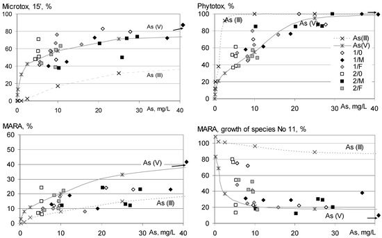 Ecotoxicological examination of environmental samples should thus be an important complement to chemical analysis in a comprehensive assessment of environmental risk [23]. Numerous assays, which use various groups of biota, representative of different food chain levels, have been adopted as ISO or OECD norms [24,25,26]. Several bioassays are now available as easy in maintenance and standarizable commercial products, and have gained increasing acceptance and popularity. They are now commonly used in environmental research, particularly in the analysis of acute toxicity, determined usually in the first step of tiered environmental risk assessment procedures. Bacterial bioassays are used particularly extensively for the assessment of acute toxicity as they are rapid, simple, and highly reproducible [27,28]. A worldwide used Microtox® toxicity test is based on the inhibition of bioluminescence produced by bacteria Vibrio fischeri (reclassified recently as Allivibrio fischeri) when exposed to toxic compounds present in water [28,29,30]. It can be applied for the risk assessment associated with rock, soil, and water pollution in metal ore mining sites. A suitability of this test for the assessment of As toxicity in environmental samples has already been confirmed; however, the reactions of A. fischeri to different As species, that is, As (III) versus As(V), proved to be strongly dependent on water pH [21,22,28,31]. Among the bacterial assays, a test MARA (the Microbial Assay for Risk Assessment), designed particularly for the examination of pharmaceuthicals and biocides, has also gained a common acceptance in environmental research [32,33]. The MARA is a multispecies assay based on the measurement of dehydrogenase activity, visualized by a reduction of tetrazolium red. The set of diverse microbial strains involves ten species of bacteria and additionally one species of yeast [34]. Among the acute and subchronic toxicity tests, there are a few plant-based assays. The most commonly used one is a Phytotox assay that measures a decrease in seed germination and the inhibition of root elongation of plant seedlings supplied with contaminated water or exposed to contaminated soil compared with the control based on pure water [35,36,37]. The test was recommended as a good tool for screening the environmental risk caused by metals and metalloids, including As, in mine sites [31,35].