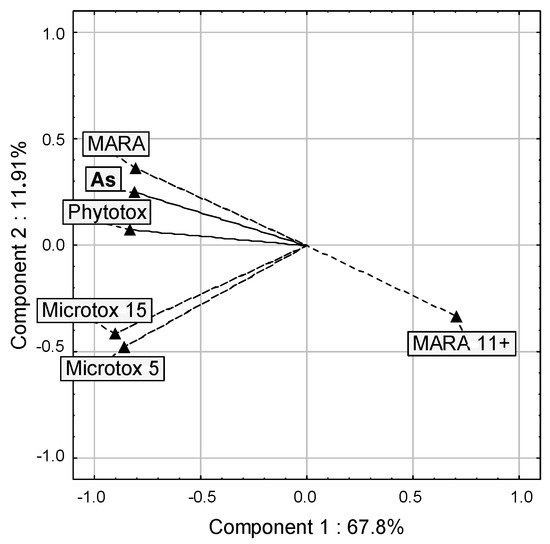 Pearson correlation coefficients R were calculated to illustrate the relationships between the (normalized) results of all three toxicity tests—Microtox, Phytotox, and MARA—and As concentrations in soil pore water. The relationships were significant at p < 0.001, and the R ranged from 0.541 to 0.719 (Table 2), which means that the results of ecotoxicity assays, with a probability of 29–52% (R2), were determined by As pore water concentrations. In the case of Pichia anomalia, an absolute value of corresponding R was relatively low: 0.407. A principal component analysis (PCA) confirmed close relationships between the indices of toxicity obtained in various assays and As concentrations. A related graph (Figure 4) illustrates a particular interdependence between the result of MARA, Phytotox, and As in pore water, which were similarly determined by two main principal components 1 (67.8%) and 2 (11.9%). The latter, in fact of relatively small importance, was apparently the factor responsible for different responses of Microtox (both after 5 and 15 min) and two other assays to the same level of As in pore water. It was probably a set of pore water components, including the concentrations of phosphates and low weight organic compounds, which were not directly determined in this study, that modified the toxicity of As. Rubinos et al. (2014) proved, for instance, that P presence in water could protect aquatic microorganisms against As(V) toxicity. Similar conclusions were drawn from the studies related to higher plants [3,6,9].
