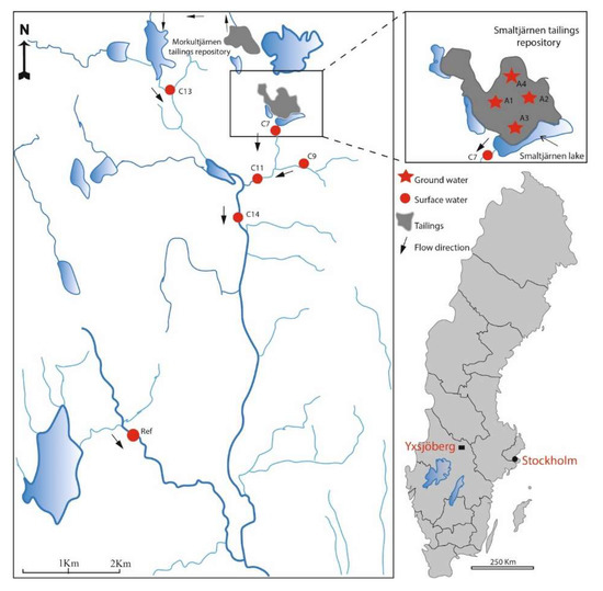 - Höglund, L.O.; Jones, C.; Lindgren, M. Förstudie för Efterbehandling Av Sandmagasin i Yxsjöberg; Kemakta Konsult: Stockholm, Sweden, 2004. (In Swedish) [Google Scholar]