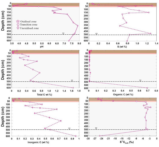 | Sample | Depth (cm) | pH | Cbulk | S | Organic C (Corg) | Inorganic C | δ13Cbulk | δ13Corg | δ13Ccarb | Remarks |