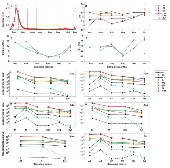 - The lower δ13CDIC values of the mixed surface waters (i.e., C7 and C11) downstream of the Smaltjärnen repository in May are regulated by the degradation DOC from the mires and forests during the high discharge from the snowmelt.