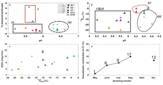 - The myriad of potential in-stream biogeochemical processes regulating the δ13CDIC signatures of the downstream surface waters from June to September and the lack of DIC concentrations makes it difficult to decipher the dominant process. In view of this limitation, other isotopic systems and elemental concentrations may be helpful in unravelling the dominant biogeochemical process or source.